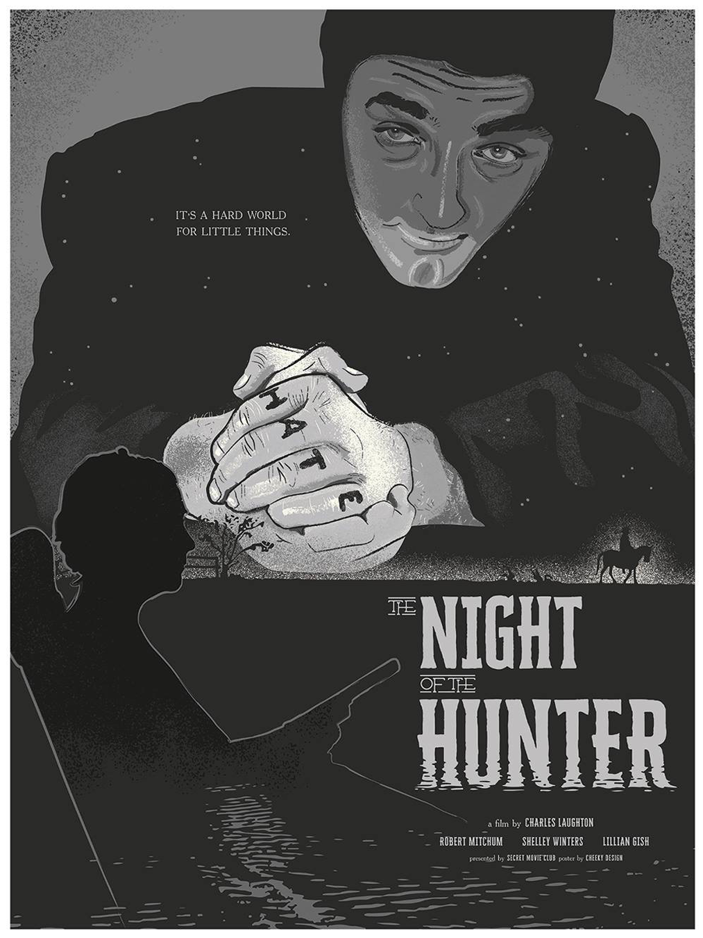 Night of the Hunter movie poster featuring an illustrated Robert Mitchum leaning forward as well as the silhouette of granny in her rocker wielding a shotgun. Iconic.