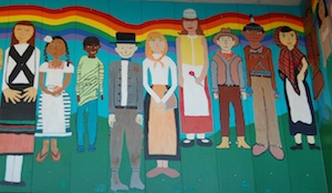 The Art Enrichment program was a before and after school program available for students in 4th and 5th grade in Music and Art. One of the semesters of studies in both areas focused on diversity of the American population. Mary Sommersberger, the Music Teacher, selected a variety of ethnic songs for the students to learn. Sherril Vandenberg, the Art Teacher, had students research the native dress of a variety of children from around the world. The diverse population of Washington Elementary was the starting place. Each student designed their child from the research they had done. An end of the school year program was the culmination of the combined work. The Art Enrichment students performed songs from around the world and the new children were installed on the gym wall. Each year the program ended with the song “Weave Us Together” while the students wove the ribbons of a Maypole together. This tradition took place for several years.