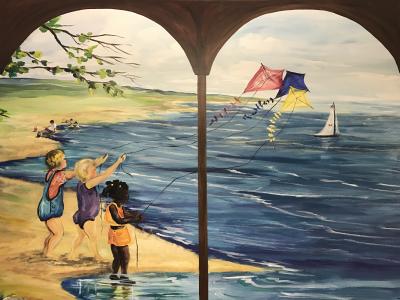 During September 1998, the walls of the Landwehr Children’s Library Center came alive with the work of muralist Joyce Winter of Menomonee Falls. Winter created a series of artwork that depicts themes of families, sites of Sheboygan, and outdoor adventures during Wisconsin’s four seasons. A frieze in the Story Garden features a look “Above the Garden Wall” showing sky, sun, rainbows, clouds and birds.Other areas feature the unifying theme of arched windows that “look” out onto scenes of places and people from the area. Several local children and adults served as models for Winter.