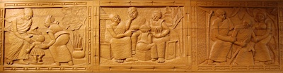 Panel Two deals with the adolescent who leaves the home to start a new life. While the parents hate losing a child, they leave the child with advice, expecting the child to uphold the family dignity. The bent plant tied to a straight pole represents a child; the pole represents parents. The border design symbolizes the parental control over the family.