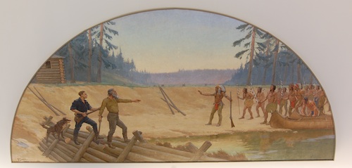 This mural is titled "William Paine and Colonel Oliver Crocker with Native Americans in the Building of the First Dam on the Sheboygan River." This Native American mural shows the American landscape painting style known as the Hudson River School. The colors are subtle pastels in grey-blue and earth tones.