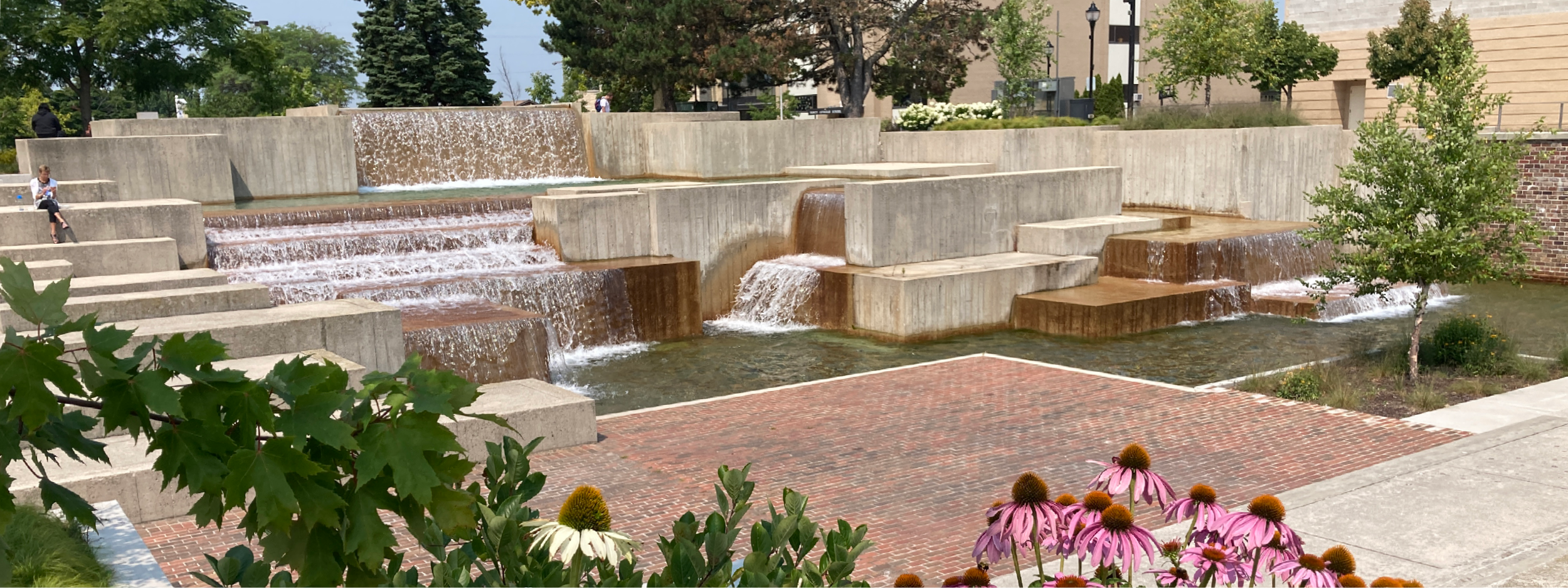 Plaza 8, including the water feature next to Mead Public Library, was designed by the firm of noted landscape architect Lawrence Halprin.